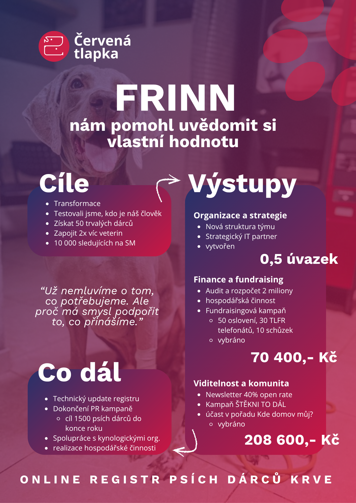 Ve FRINu se chceme naučit, jak takto velkou kampaň dobře naplánovat a zvládnout. Nejde nám jen o jednorázové dary – rádi bychom navázali vztahy s lidmi a firmami, kterým dává naše práce smysl a budou s námi i dál.